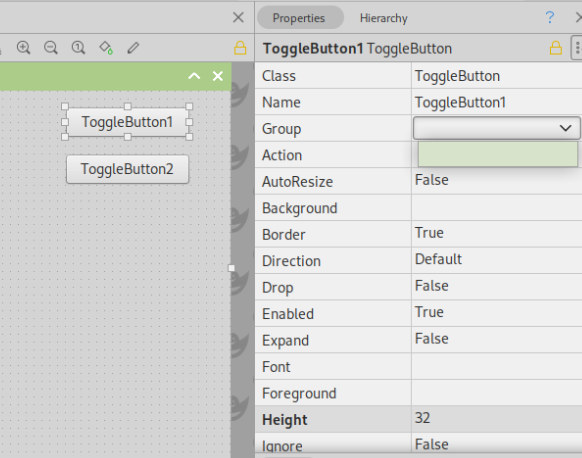 for gbWilly: I just followed your latest advice on entering a group, and you are right - nothing appears in the attribute 'Group' box in this version (3.19.3) of Gambas when you type something, but if you then change another attribute of the same control, it is also updated, so the 'Group' entry appears. I guess this has been the source of my problem all along, since its a fairly obvious thing to do to create a new Group in the new IDE - but not realising there is a bug, and seeing nothing, I assumed I was doing something wrong (I know - one should never assume….). Hope this bug gets sorted soon.