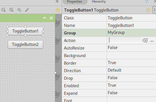 Another Question (Sorry) - As described, I now have my Group, and it all works just as you described and I want…. but…. I tried to create a second group or buttons in another frame on the same form, still using ToggleButtons. When I came to allocate them to the (second) group, I found the dropdown Group attribute contained the first group created, as expected, and I blithely assumed I just had to type in the name of a second group for my second button Group - but no.