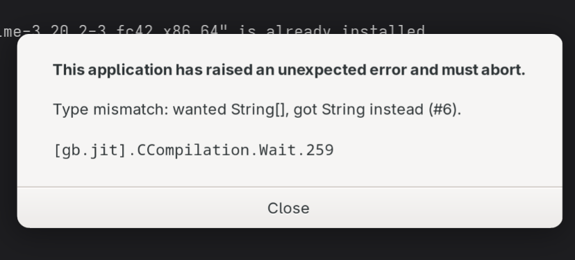 I'm running Fedora 42. I have tried installing the RPM from the fedora database and have tried building from source as well. The installation has been smooth but I always get this error when launching the application. I've restarted the system, uninstalled Gambas3 (and many of the components including jit) and removed the directories, and re-compiled to no avail. Has anybody faced this?