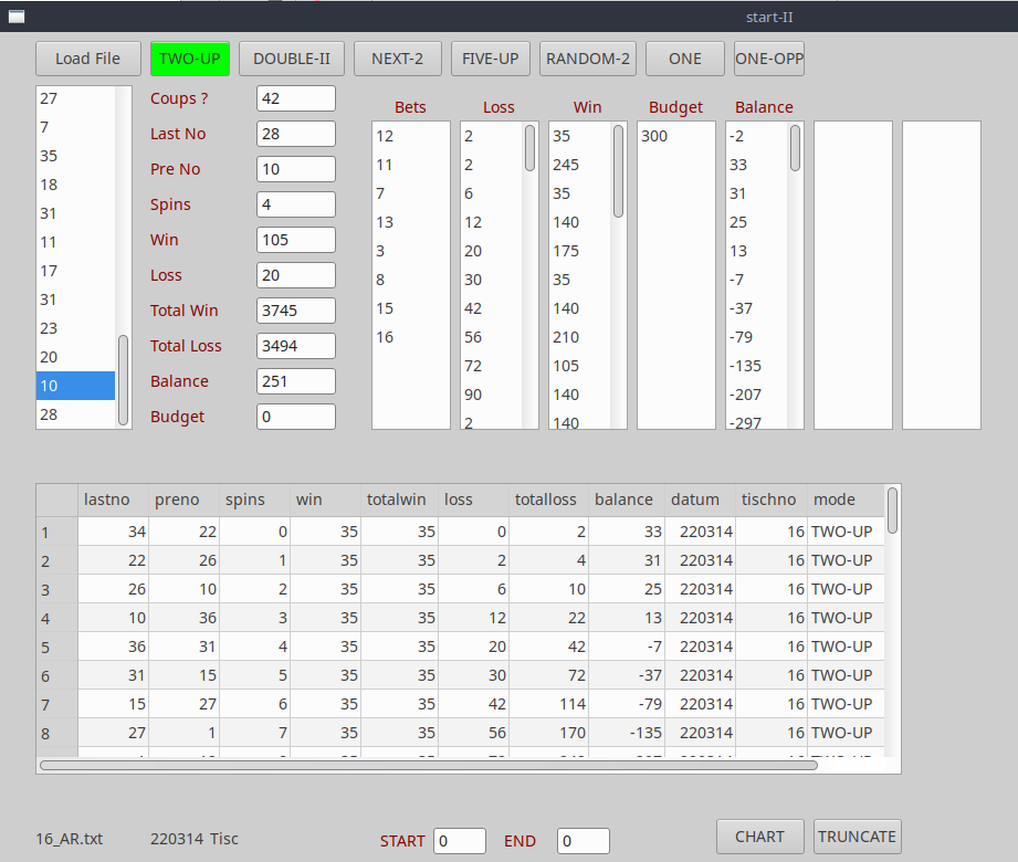 While the For/Next loop is running through the items of Listbox1 (a list - about 200 items - of Numbers from 0 to 36), it produces "loss" or "win" and a "balance" all of thouse listed in further ListBoxes regarding to thier variables: