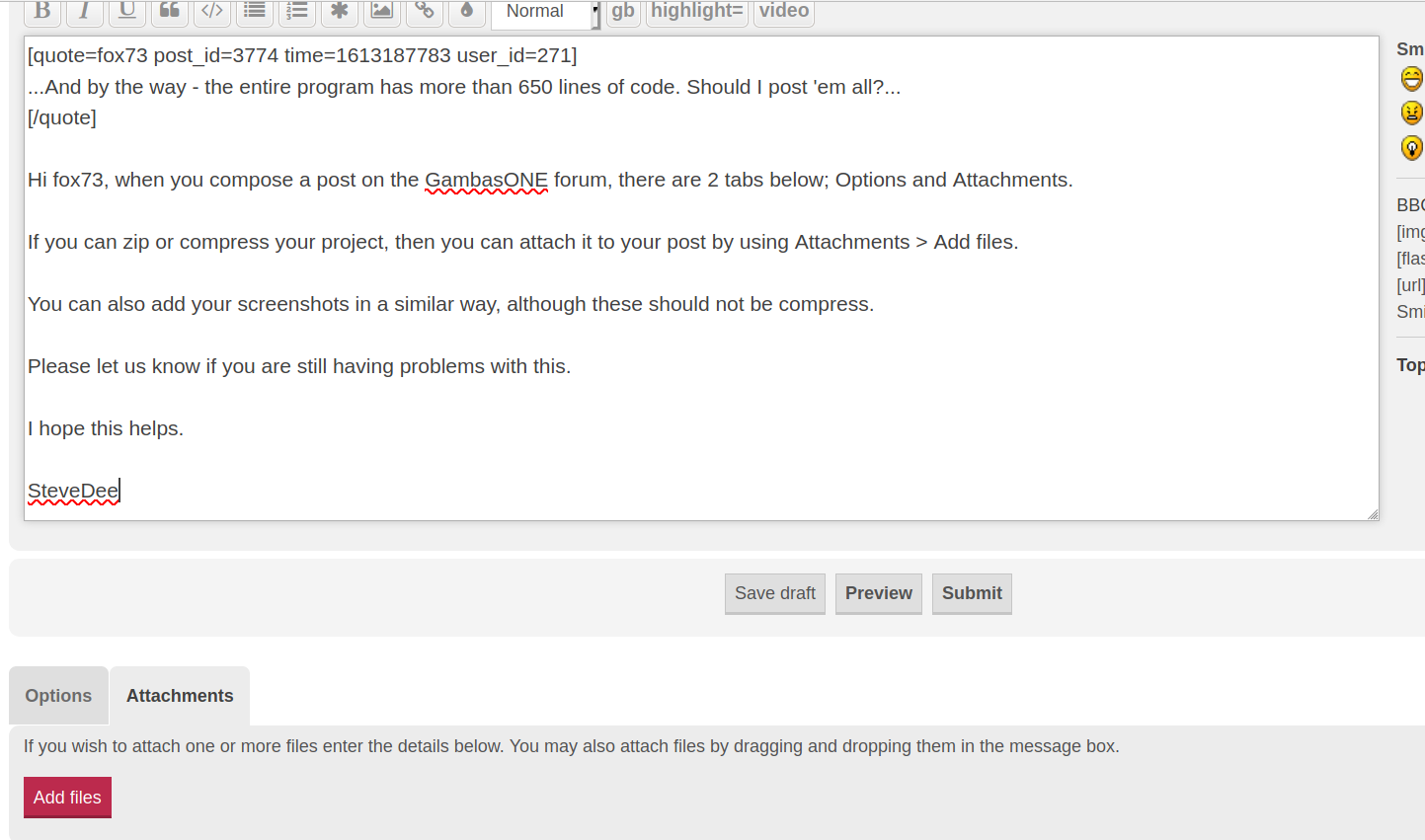 Hi fox73, when you compose a post on the GambasONE forum, there are 2 tabs below; Options and Attachments.