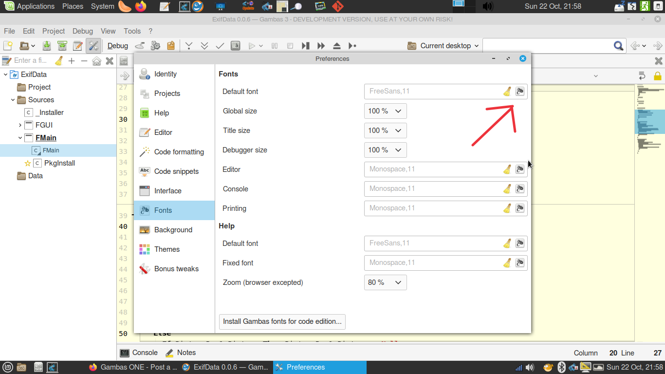 Hi, I'm using Kubuntu 23.10 and have just installed Gambas from the repositories after adding the ppa. The problem is that the editor font is too small but I'm unable to change it because all the font fields in preferences are greyed out. Thanks for any help.