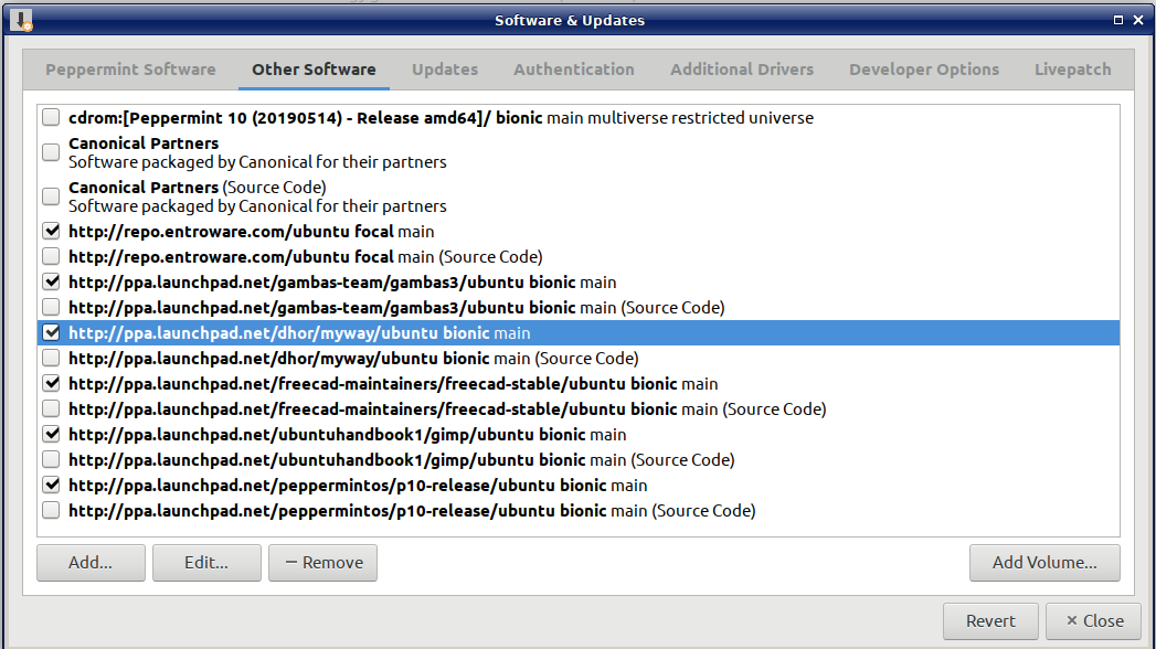 Hi Doc, If you have Synaptic installed (…which is still my favourite program for installing/removing packages) navigate menu Settings > Repositories > Other Software
