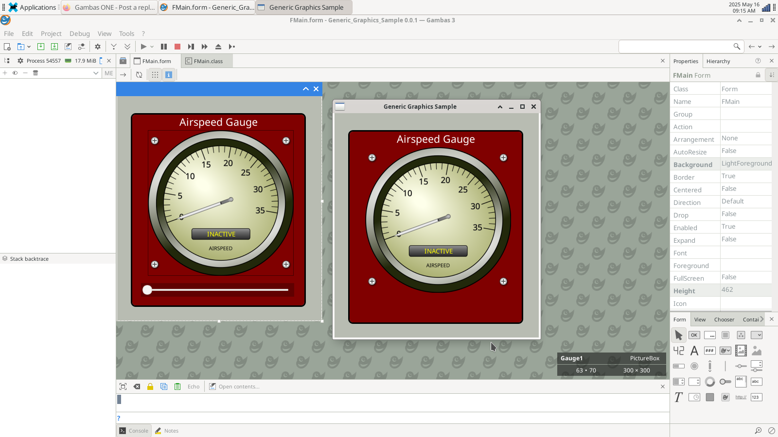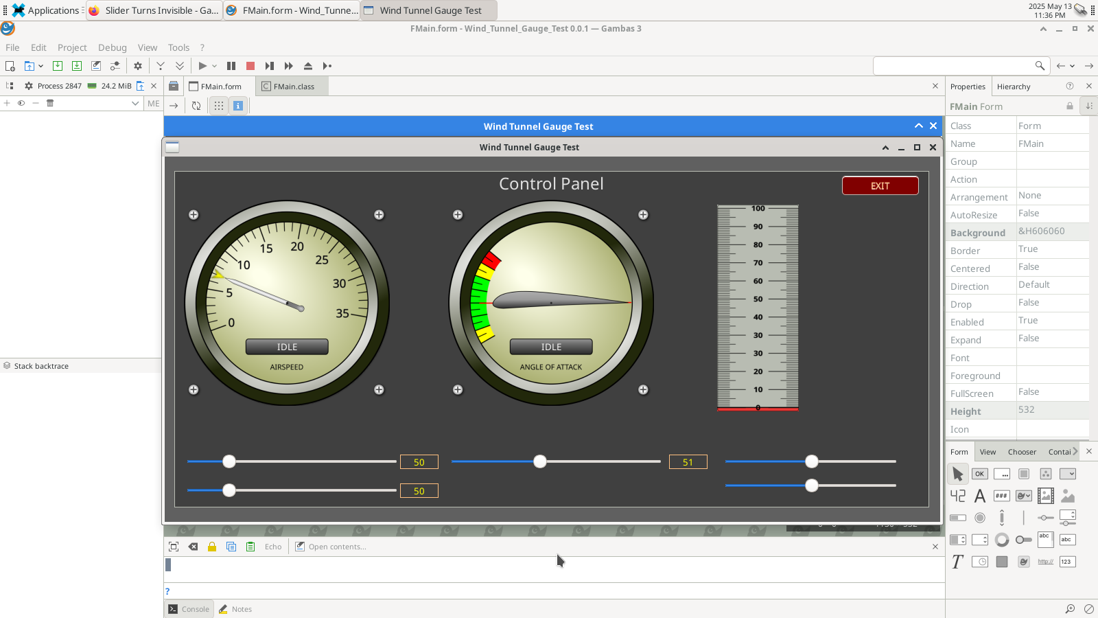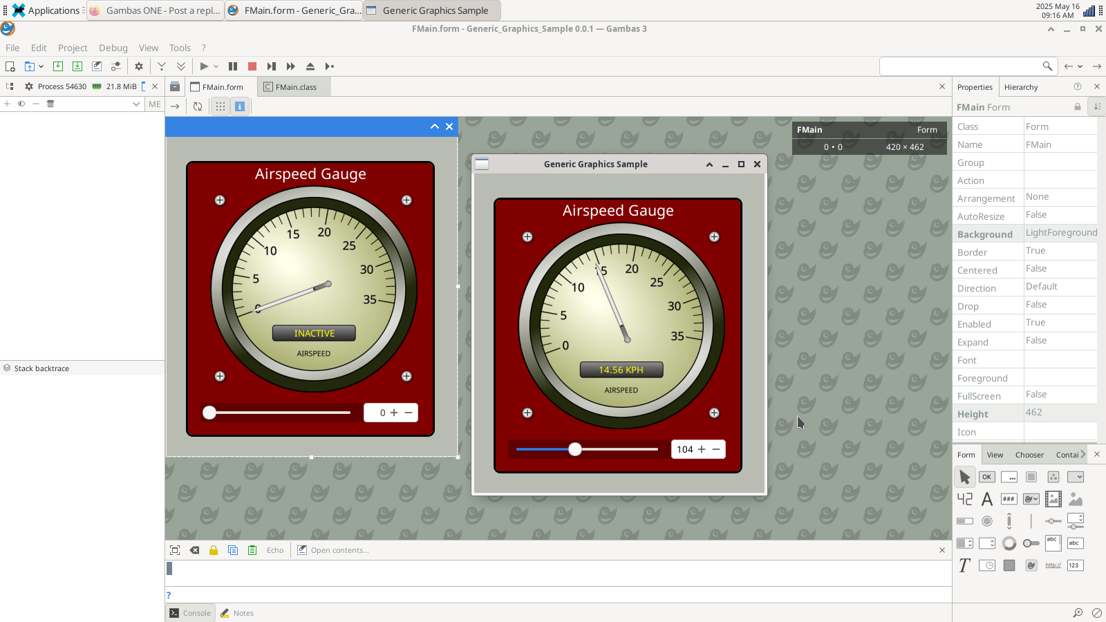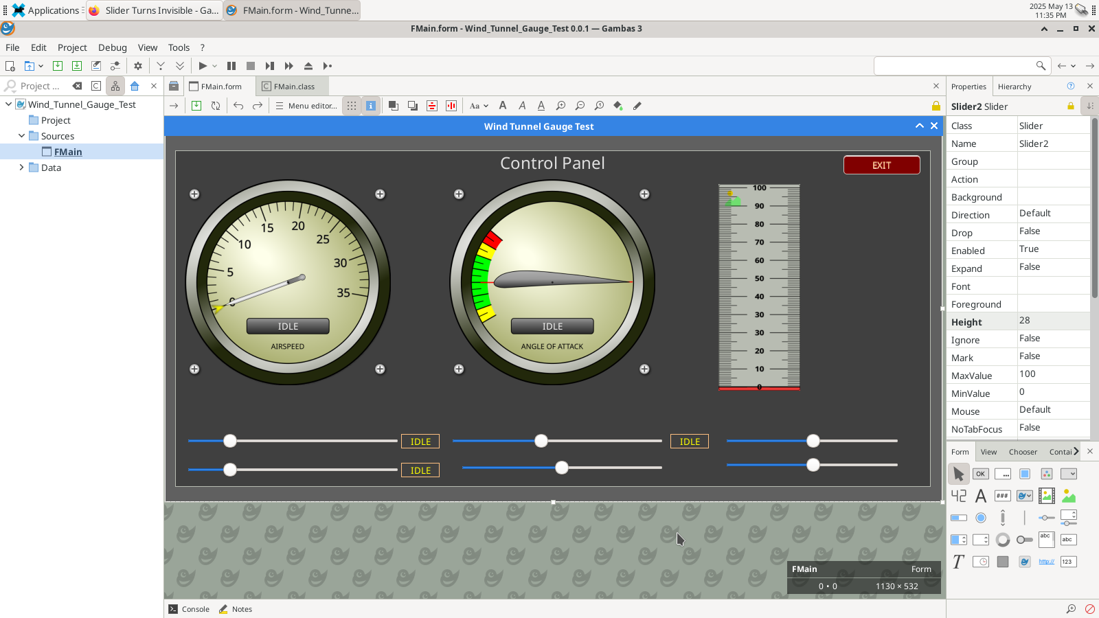 If I go to create a new slider, it is automatically set to the back… I have to move it to the front. I upgraded and did a sudo apt-get install gambas3 so it now has version 3.18.0 which is the latest on the distro for BOOKWORM. As I stated before… on both my Raspberry Pi 3B+ and my Raspberry Pi 400, there are no issues. (However I think they are running the QT version if I remember correctly.)