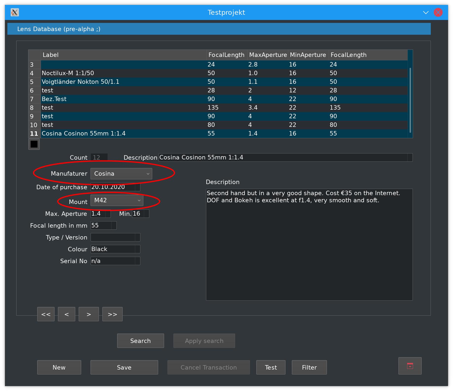 The app allows new entries for lenses, mounts and makers (manufacturer). If there are images of the lenses available you can drag and drop them into the appropriate field. Images are stored as jpg in the Image-folder. The entire data about lenses is stored in the database.