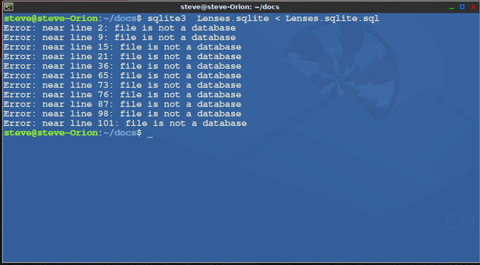 $con.Host = User.Home & "~/docs"The file (attachment "Lenses.sqlite.tar.gz" from earlier post) is a dump of the original database. Extract the file and create a new database with the command line