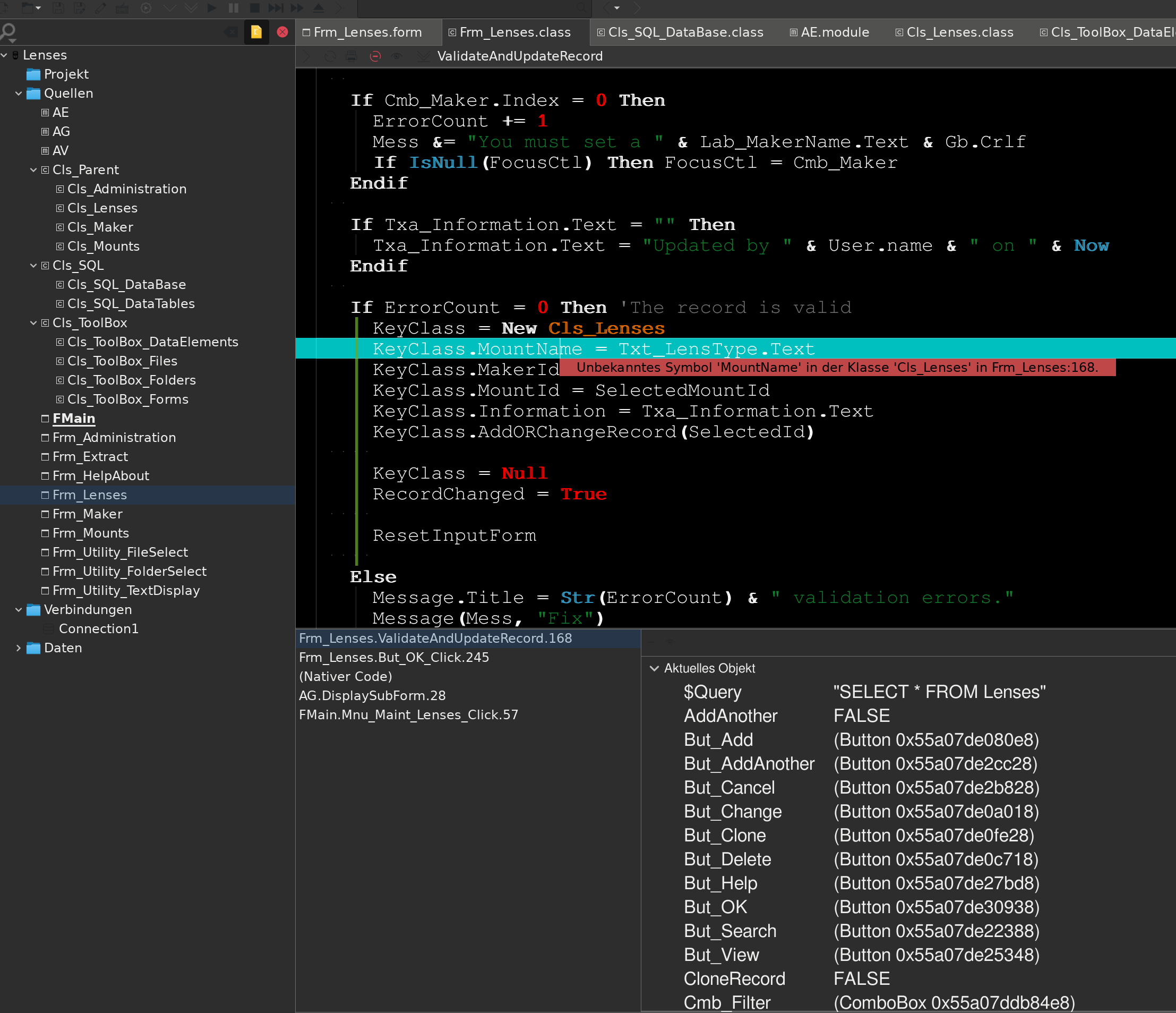 I still have a closer look into code, was cranking up the debugger and set a lot of breaking points. At some point I was wondering what happens when I double click a row in the Frm_Lenses. The panel "Pan_Tools" disables, the form seems to hang but still responses to mouse clicks. In debugging mode the code points to some other actions but I cannot find out what the purpose would be.