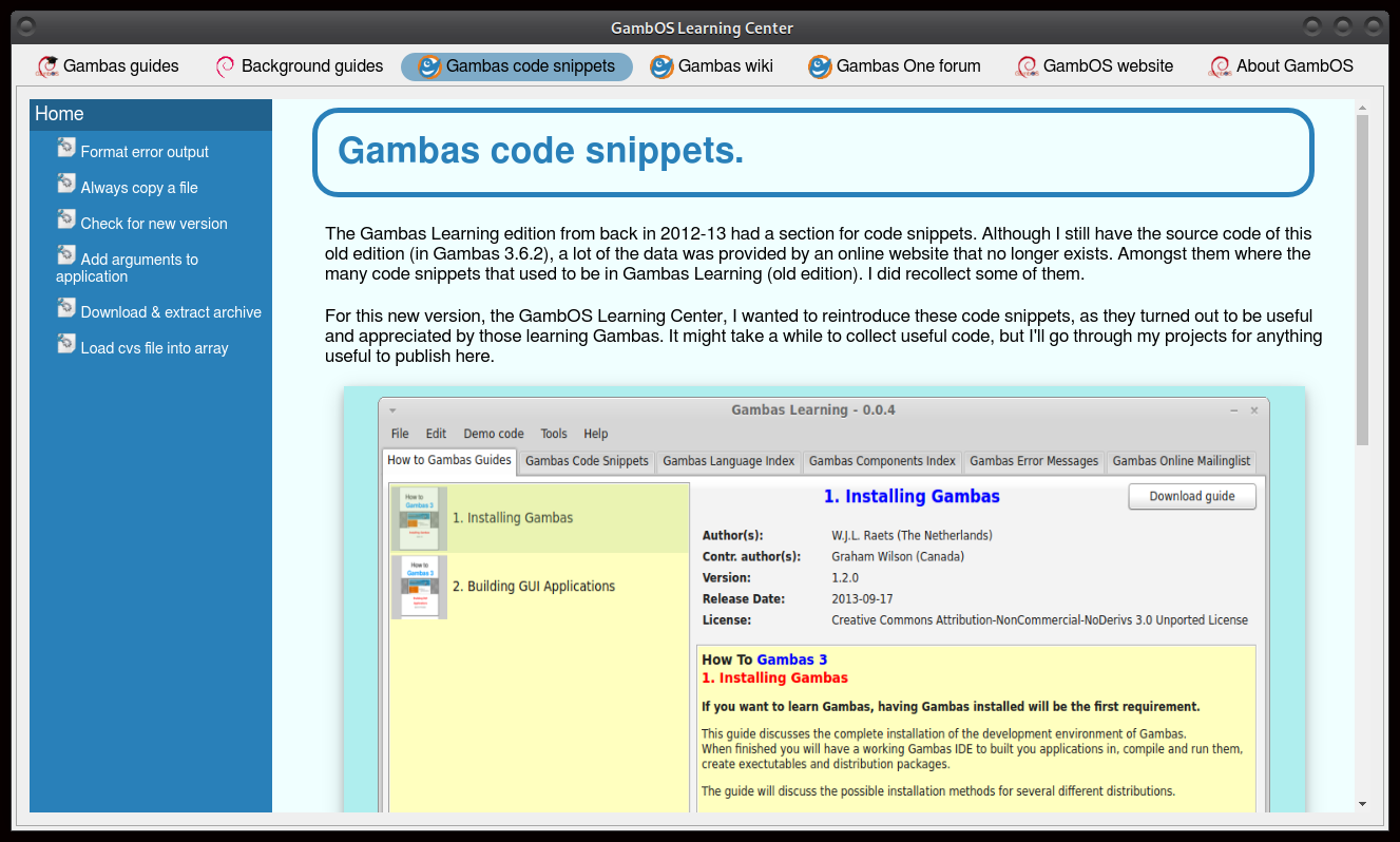 This version now has a tab with code snippets (like in the old Gambas Learning)