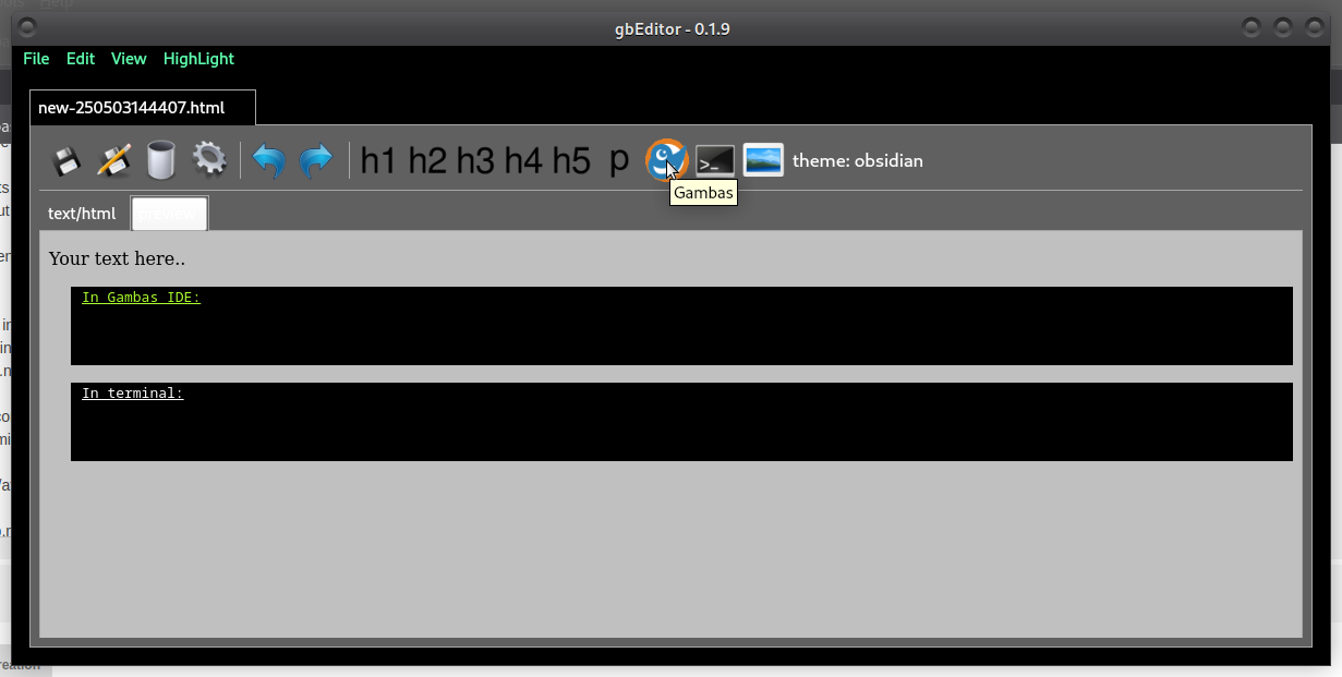 All that involving expanding my private editor last night, to support expanded html editing (read insert pre set html and put that behind a button, so inserting a code box is a matter of a click, with cursor positioned to type the code -> see image below). Yes, the guides will be html based and I'm figuring out how to create a separate .deb package for them (so only documentation and no code), so guides and GambOS Learning can be separately updated.