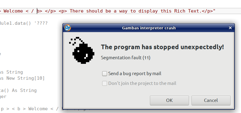 I did find a topic from Seany about ‘Rich Text Editor’ where Cogier suggests some solutions, but I cant’ get them to work. Error messages galore. Something to do with gb.qt4, gb.qt5 and such. I wanted to activate those but my Gambas version (3.14.3) didn’t like them.