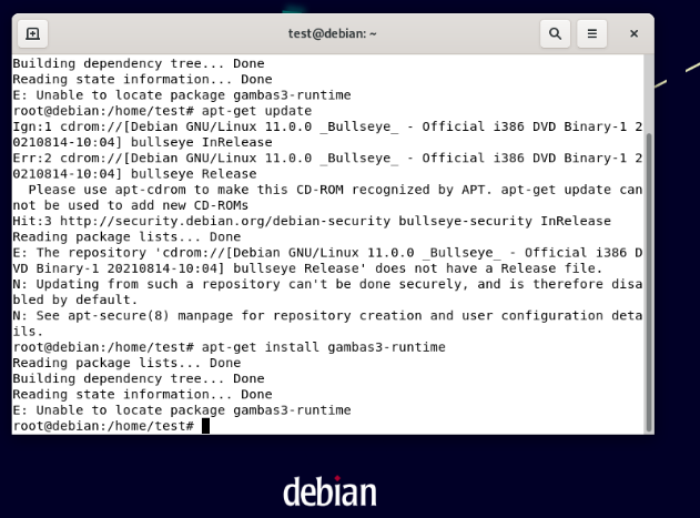 …What I am meaning about debian is that it can't resolve the dependancy of Gambas3-runtime version 3.15 or higher. I also can't install the runtime manually as gambas3-runtime is not found in the debian repositories. I am wondering if they exist for Debian 11 or is there another repository I need to install to get to gambas runtime