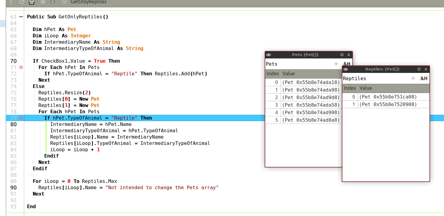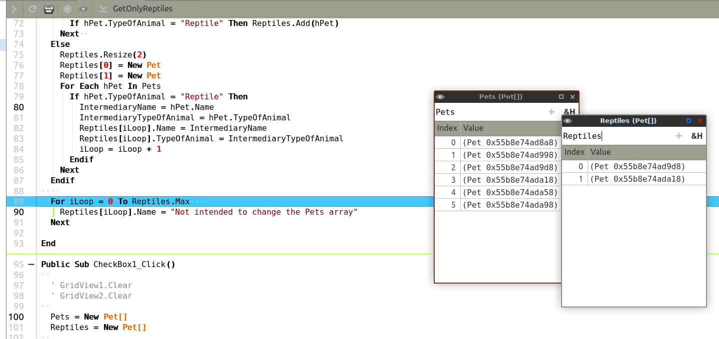 HOWEVER, I've come up with a sort of a solution/workaround/hack to fix this shortcoming of shallow copies. By assigning each element of the master array Pets to intermediary strings, and THEN assigning those intermediary strings to the elements of the child array Reptiles, the master array Pets is completely unaffected by changes made to Reptiles, This is demonstrated in my modified version of your code by unchecking the CheckBox1 checkbox. Checking the box once again demonstrates once again the shallow copy "bug."