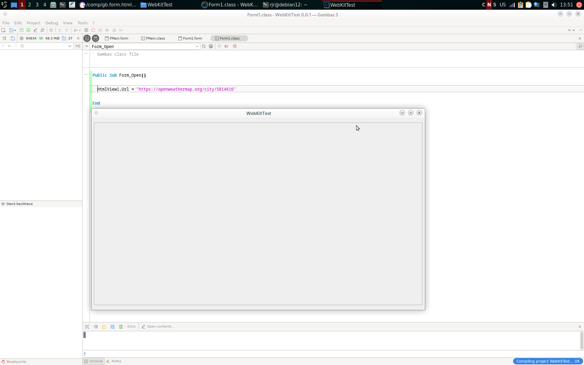 I've tried it in a VM with debian 12 mate and gambas master from 25th of April. Same here, it seems form.htmlview is not doing it's job well.rj71 said