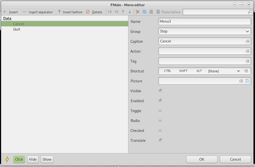 Next run the application and see what happens if you click menu Cancel and menu Quit.