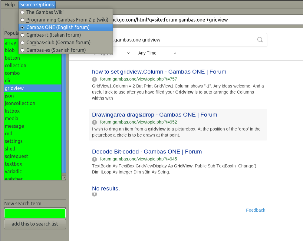 BrianG's program sounds much more specific and sophisticated than mine. One thing I like about my approach is that I seem to get not only the most relevant links at the top, but also get related stuff (even from Gambas ONE) in the search list.
