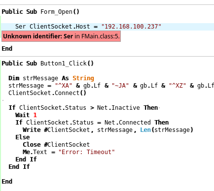 You probably need to start again by creating a Gambas project including the gb.Net component. Then you can add a Button and a Socket to the Form.