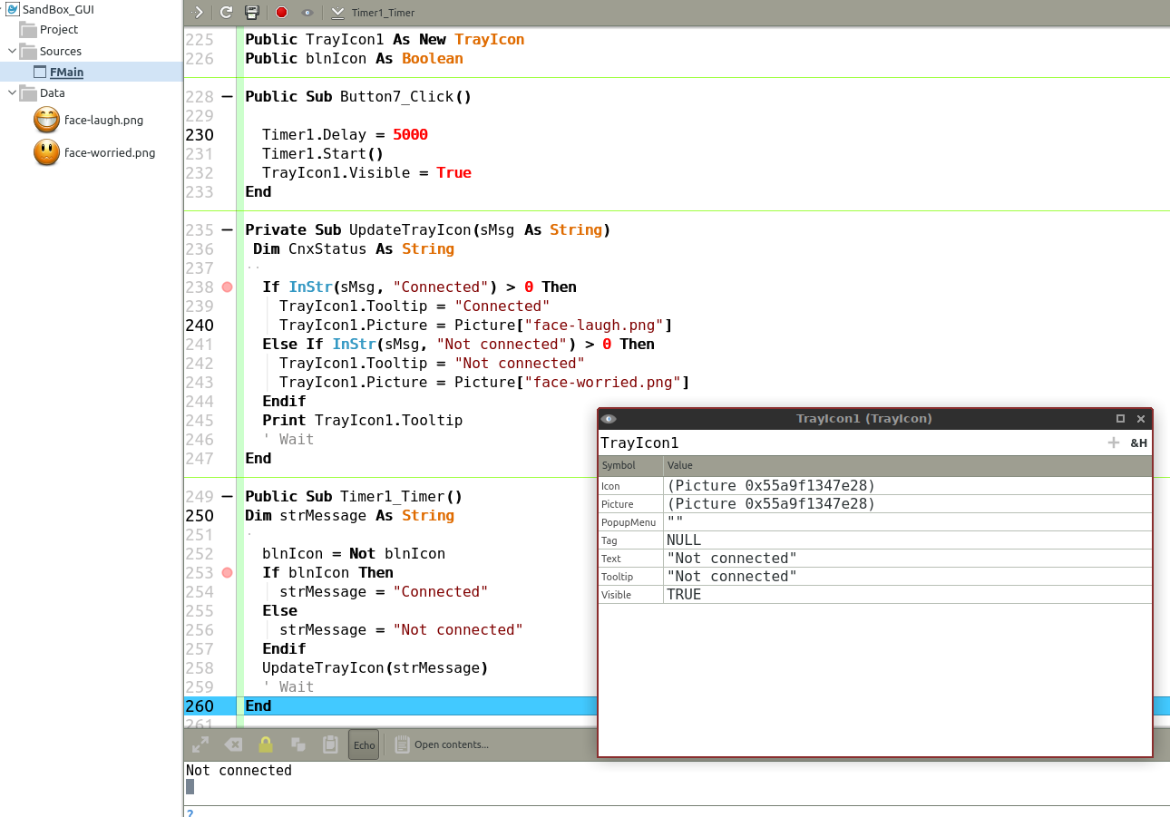 ' Gambas class file .Height = 300 .Width = 650 .Arrangement = Arrange.Vertical .Padding = 5 .Height = 28 .Alignment = Align.Center .Tooltip = "Connected" .Tooltip = "Not Connected" .Delay = 3000 .Trigger .Start TrayIcon1.Show TrayIcon2.Hide TrayIcon1.Tooltip = "Connected" Label1.Text = "Connected" TrayIcon1.Hide TrayIcon2.Show TrayIcon1.Tooltip = "Not connected" Label1.Text = "Not connected" bSwitch = Not bSwitch TrayIcon1.Delete 'This stops the program from continuing to run
