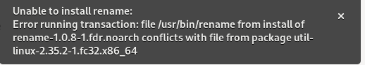 Apparently the package util-linux-2.35.1-1.fc32.x86_64 already contains a file/binary named 'rename'.