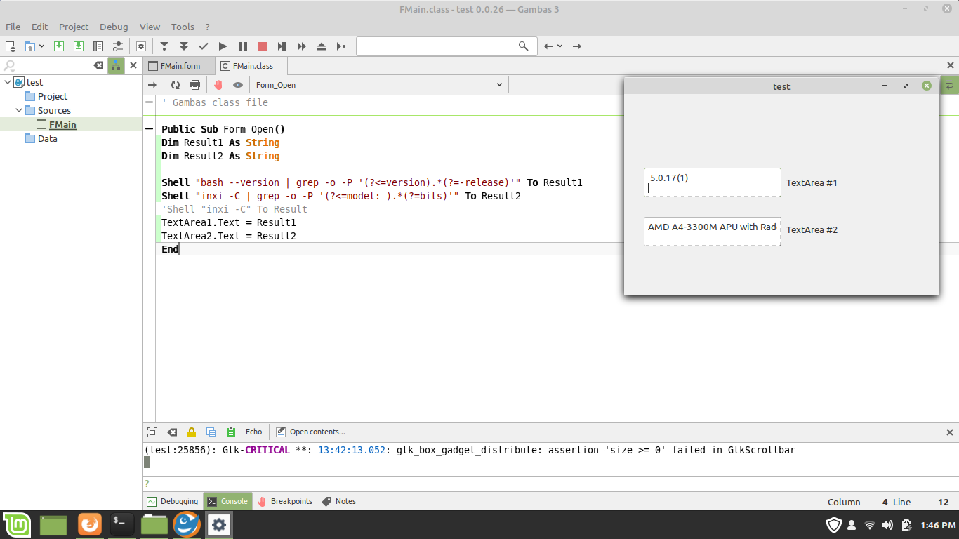 …When the button4 is pressed in the IDE the textarea100.text displays the processor installed in my PC. But when I make an executable, called forms.gambas, and then click on the icon, the form opens up. But when I press Button4, the testarea stays empty…