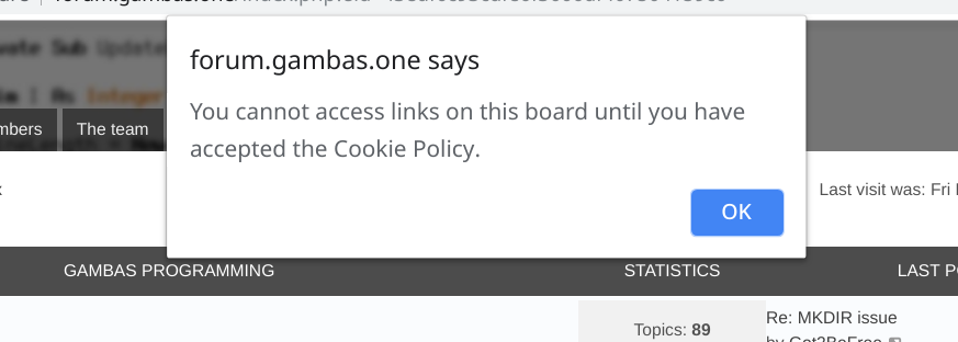 The problem is that if a non-GambasONE user does a web search for (say) "Gambas did you know" the GambasONE site appears as one of the results in the search list. You can then open the link (that works fine) but if you try to select another page from that thread you get the "forum.gambas.one says You cannot access links on this board until you have accepted the Cookie Policy.".