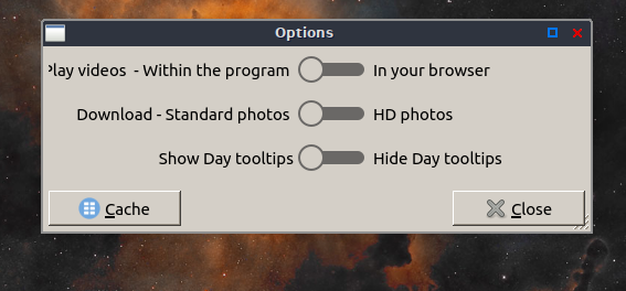 One issue I did run into though is the cache. Because I run a small /Home partition, most everything goes to a large "storage" partition and I then create links in /Home to those. When I seen where the cache was building up, I deleted the /NASA_APOD folder. When clicking the cache button again, an explosion occurred and my monitor melted into a pile of goo.
