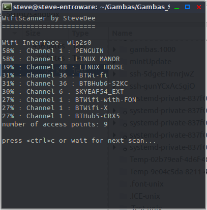 sudo ./WifiScanner.gbsIf necessary, make the terminal window large enough to fully display all APs.