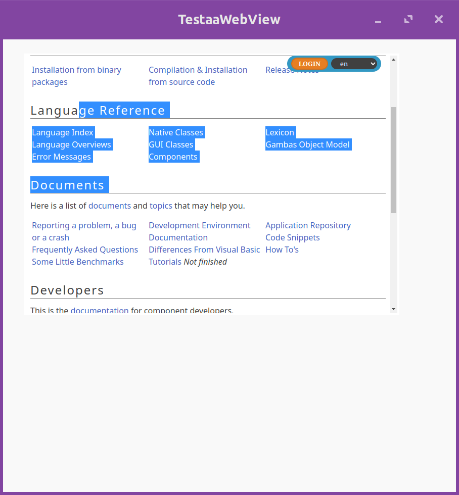 Thats what I'm using. But the "Help browser F1" won't let me select text with a mouse for copy pasting. I can only look at text and click links. I'm looking for a way to highlight and copy help texts offline. So far I can only select and copy text if I'm online and use a web browser to access / - Gambas Documentation
