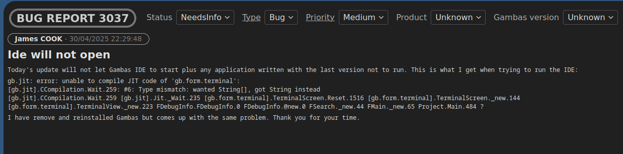 I mean the system info from within IDE (that starts again now with jit disabled), so Benoit sees things like gcc version (and a lot of other library versions). It's often external version updates that cause trouble in Gambas.cage said