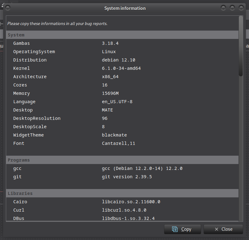 And if you can start Gambas with above copy/paste system info from Gambas to the bug report, so all used version of libs are clear